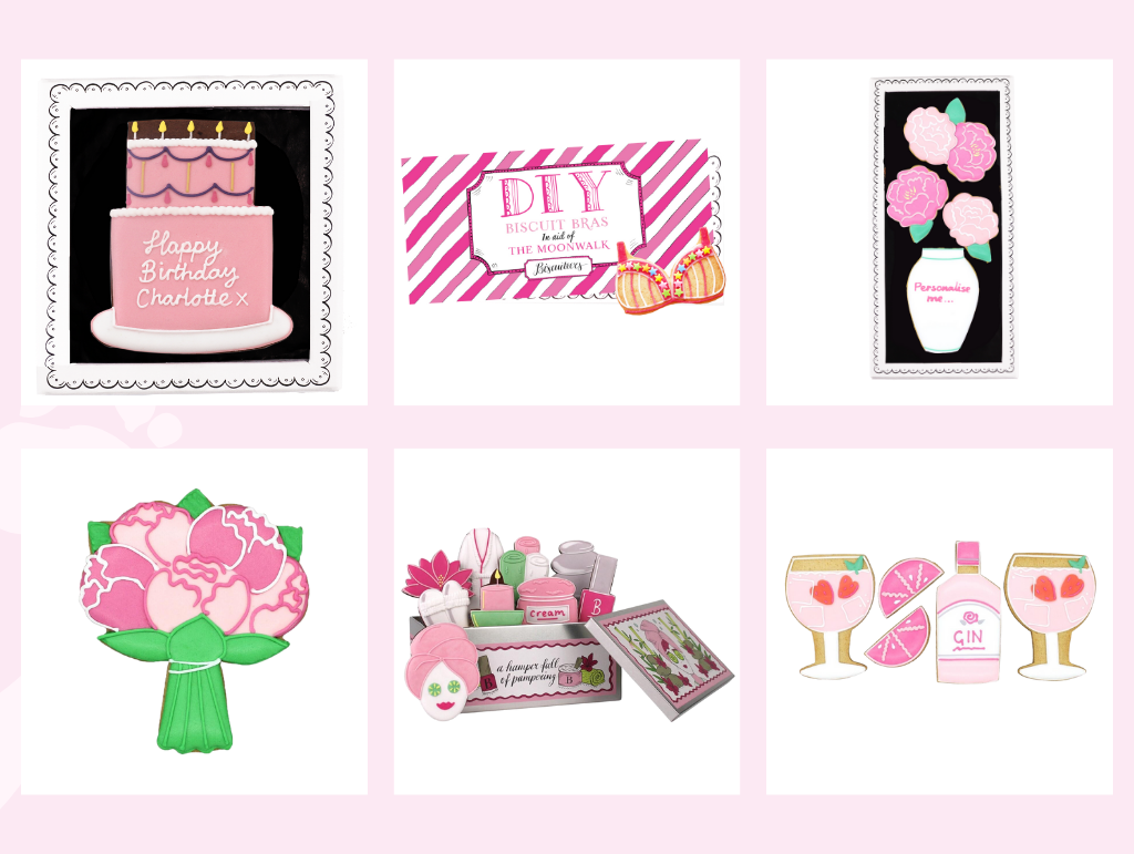 The 6 Pink Biscuit Products included in the Biscuiteers x Walk the Walk Breast Cancer Awareness Collection